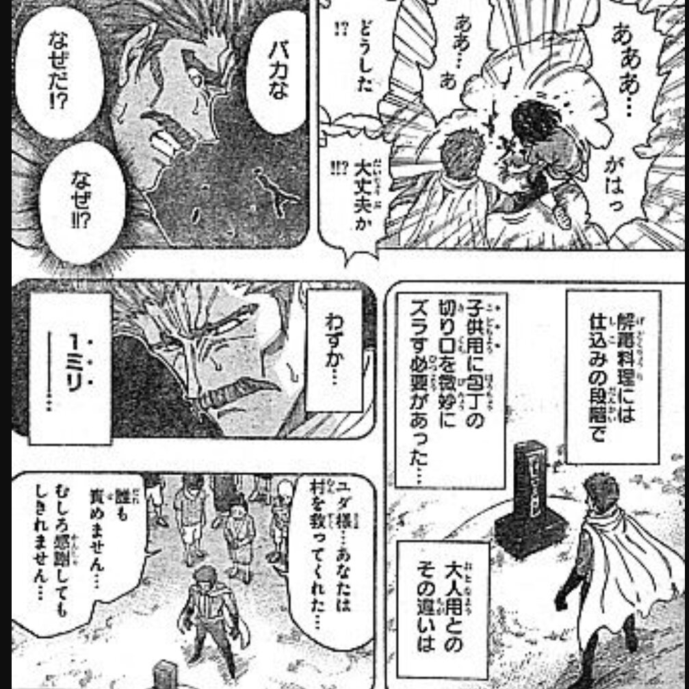 | … | 125/10/12(日)12:42:29No.1362050209そうだねx22あの世界におけるトップクラスの料理人がどれだけ人間離れした超人技ができるかってのを散々描写したあとのこの回想だから |