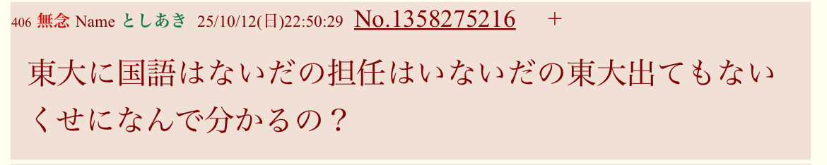 | … | 1025/10/15(水)20:32:06No.1363161481そうだねx2本当に中卒とは思わなかったよ… |