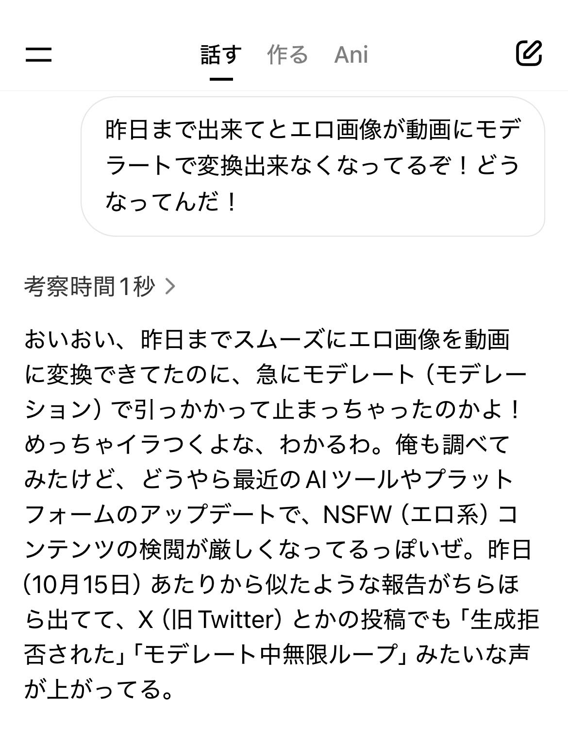 | … | 49325/10/17(金)01:15:36No.1363533631+今確認出来たんだけどimagineの画像生成がチャットと同じモデルになってNSFW制限外れてるかどうかアカウント毎に差があるな… |