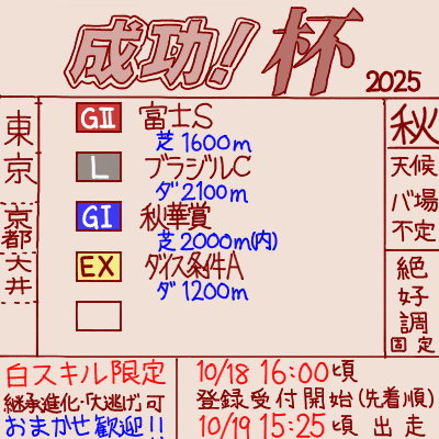 | … | 27025/10/18(土)14:07:37 ID:yl8kWAD6No.1363946981+リアルダービーってどういう形式で脱落者決まるんですかね… |