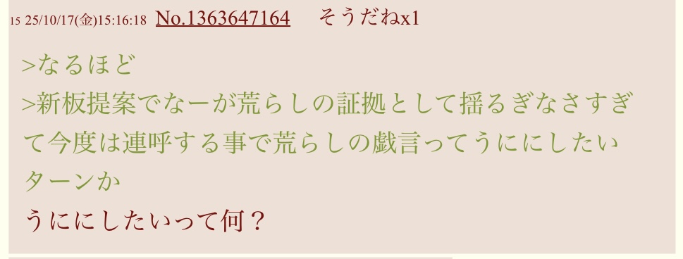 | … | 1725/10/18(土)19:59:33No.1364054948+うにがどうとかいつのスクショだよと思ったら昨日かよ |