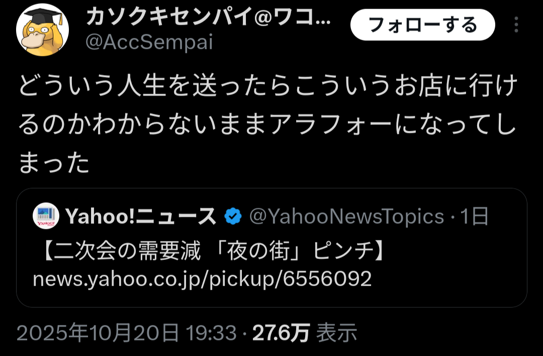 | … | 4625/10/21(火)11:22:06No.1364902381そうだねx3>実態がどんなもんか分からんけど女の子侍らすお店はなんとなく反社の香りがしそうで怖いコンカフェでもキャバクラでも |