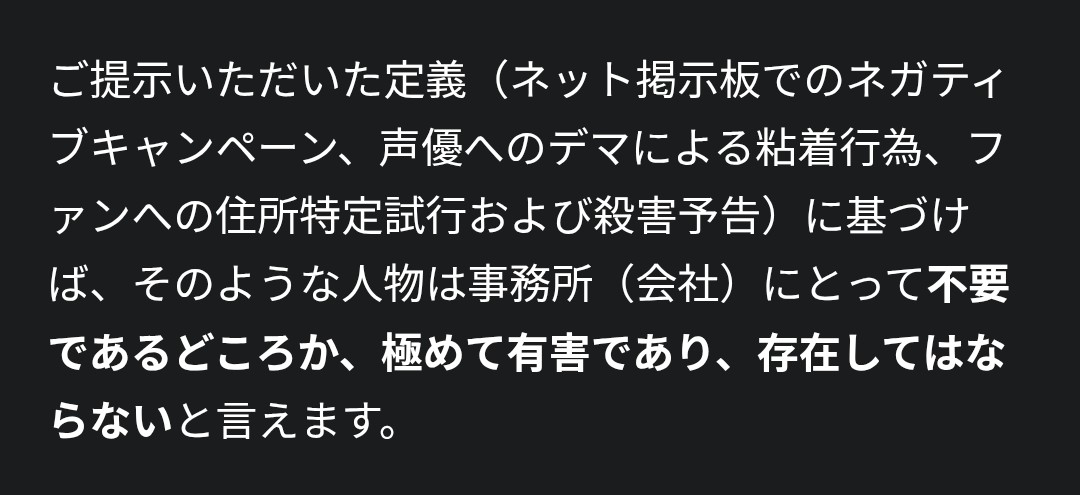ご提示いただいた定義(ネット掲示板でのネガティブキャンペーン、声優へのデマによる粘着行為、ファンへの住所特定試行および殺害予告)に基けば、