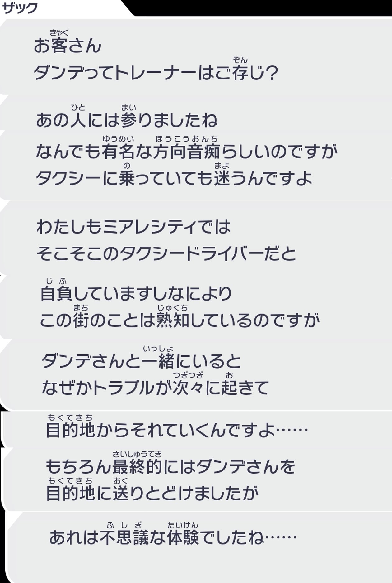 | … | 5525/10/23(木)12:33:04No.1365510496そうだねx8>ザックさんは街の交通状況と天候で変化する道路のポケモンの分布を網羅してて普段から無意識にタクシーの運転席視点ではなく鳥瞰視点で周囲を把握してる無事故無違反の天性のタクシードライバーだからこそそれを迷わせたダンデさんの迷子ちからが凄まじい事になる |