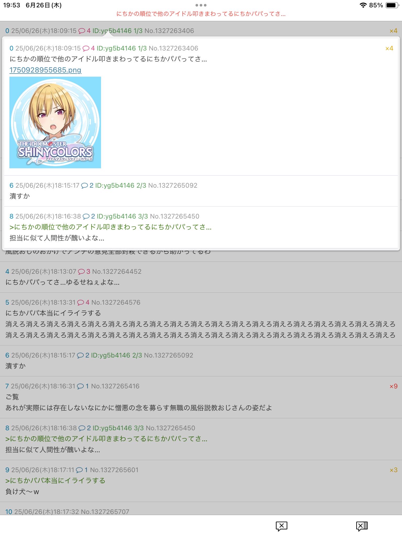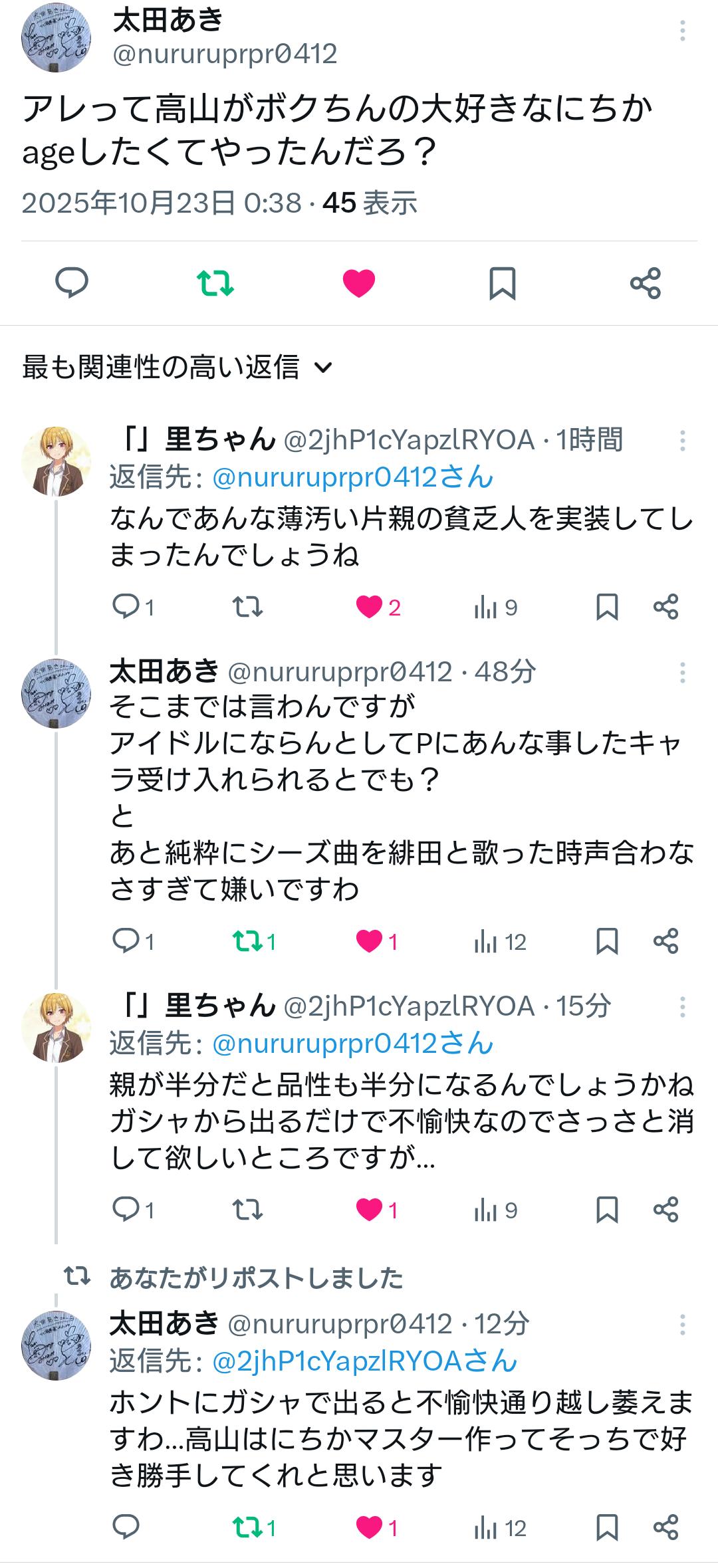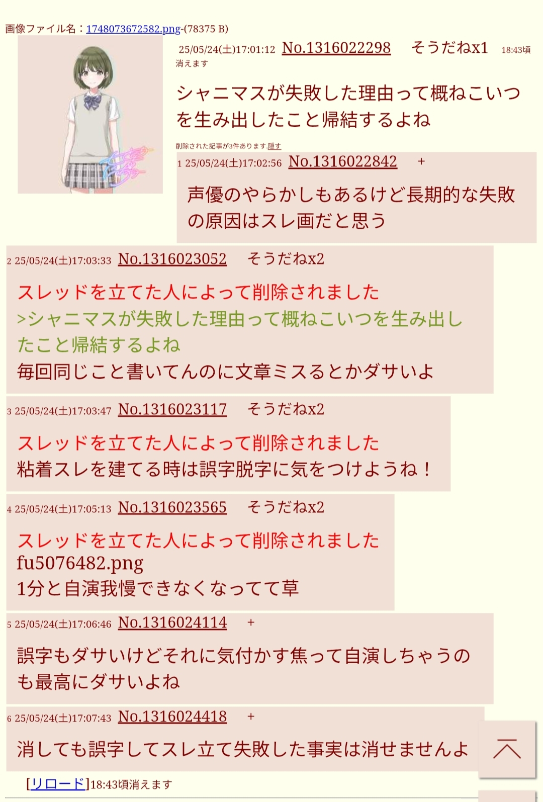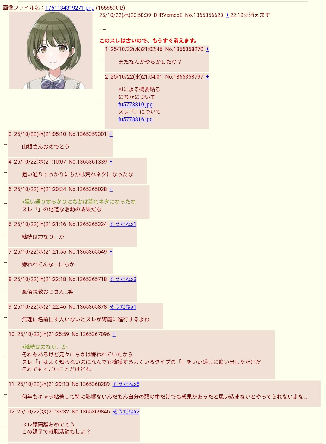 | … | 1125/10/23(木)12:08:56No.1365503571そうだねx8七草にちかに親でも殺されたのかというくらいのヘイトを持ったキモい無職がスレ立ててたので即delした |