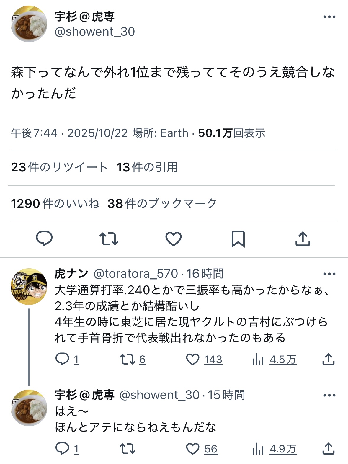 | … | 8025/10/23(木)15:51:38 ID:hB/PajgANo.1365555396+🐯来ても🦍のメジャー移籍までポジション空いてねえゾ |