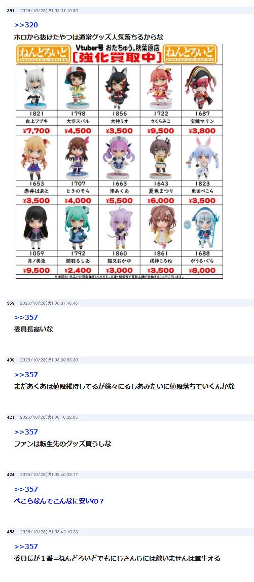 | … | 25325/10/28(火)12:19:20No.1367094294+>需要無くて値段が付かないライバーが多数居る事を恥じた方がいいのでは |
