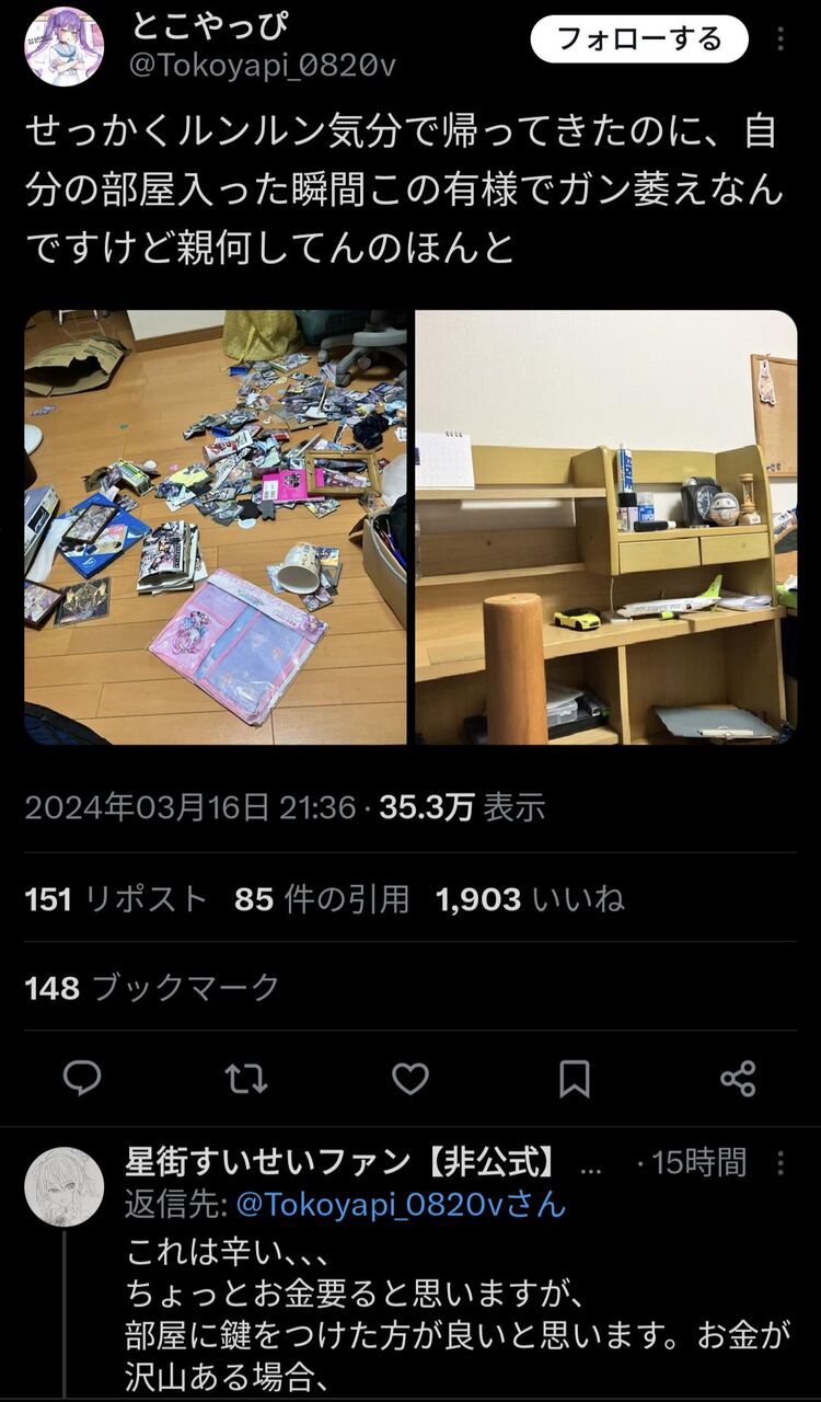 | … | 8025/10/28(火)18:10:35No.1367183635そうだねx6>スレ画だけ見ても普通親にいきなりそんなふうに散らかされないから |