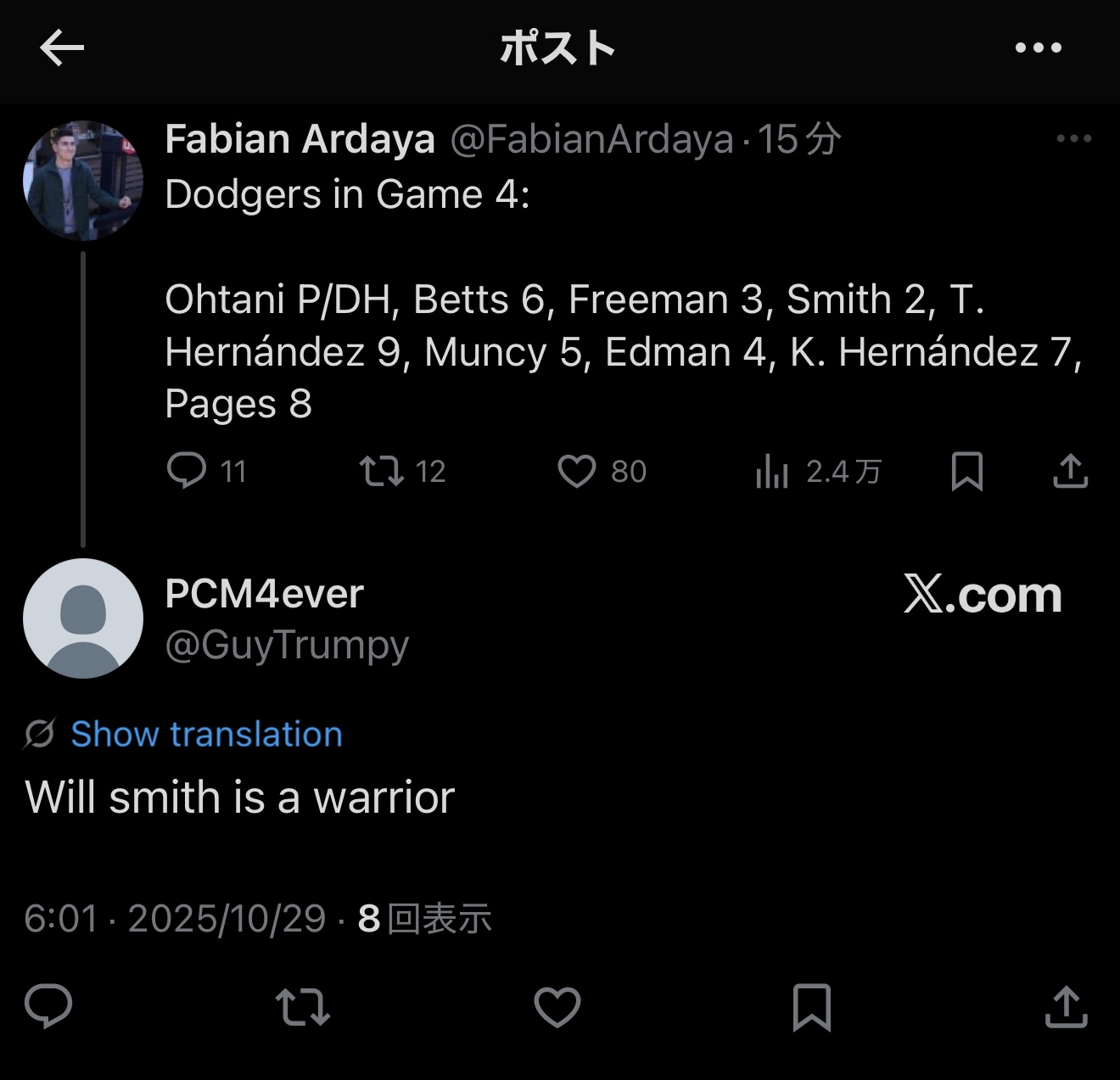 試合後、カーショーは言った。「ヤマは本気で投げるつもりだった。彼は2日前に完投して、しかも大陸横断の移動をして、朝4時に到着して、1日しか休んでない。それでも「投げられる」と言ってきた。ワールドシリーズを勝つには、そういう献身が必要なんだ」。チームを愛するカーショーはぐっと涙を堪えた。