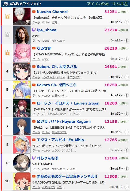 | … | 97625/10/29(水)23:22:49No.1367621020+6万はトップと倍近い同時接続だからすごい |