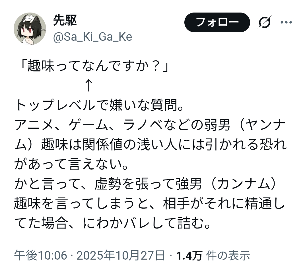 | … | 20325/10/30(木)08:19:11No.1367682569そうだねx2>趣味に対してにわかで悪いことある? |