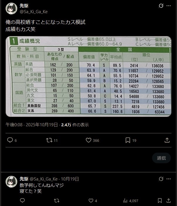 | … | 20425/10/30(木)08:19:24No.1367682600そうだねx3>高1のくせにここのおっさんみたいな奴だな |