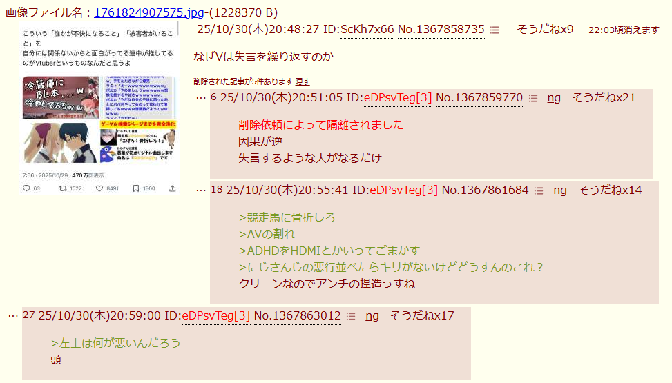 | … | 225/10/30(木)20:50:14No.1367859436そうだねx45なぜ「」は粘着を繰り返すのか |