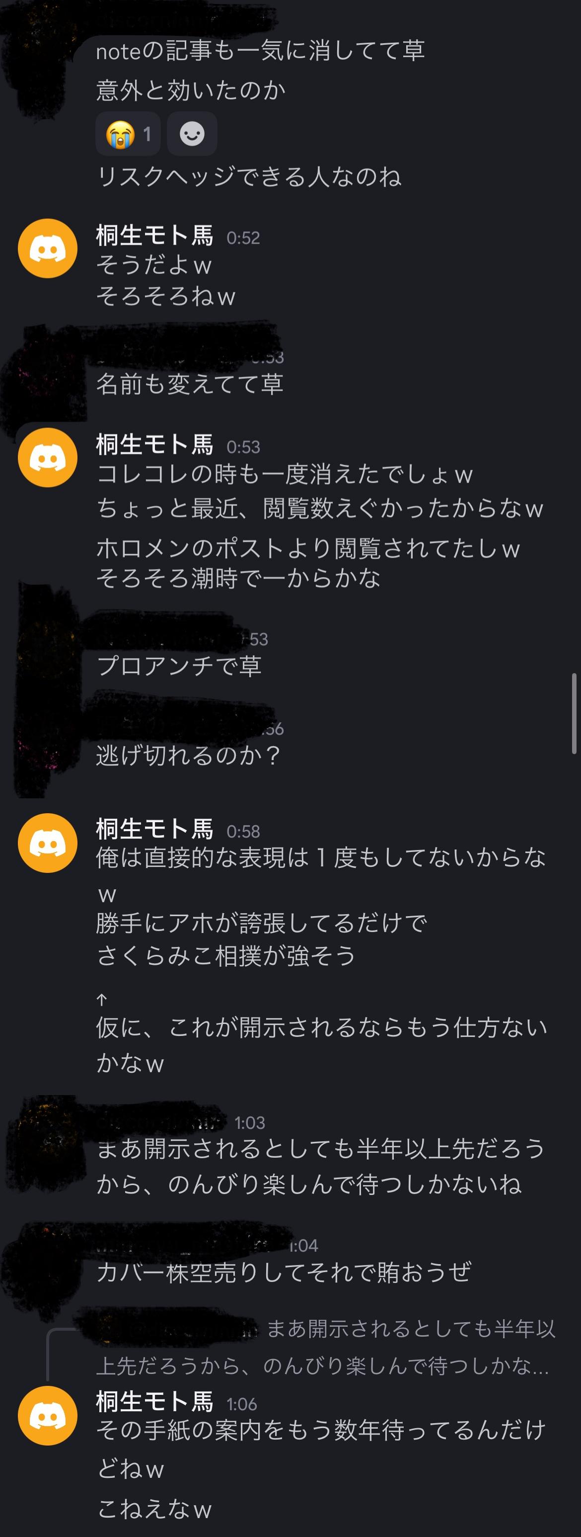 | … | 5225/11/01(土)04:34:57No.1368273926そうだねx3さくらみこ自身がリークもねぇしファン装って嫌がらせするし他を持ち上げる為に誹謗中傷されてるって言うのはだいぶガチギレしてるなって… |