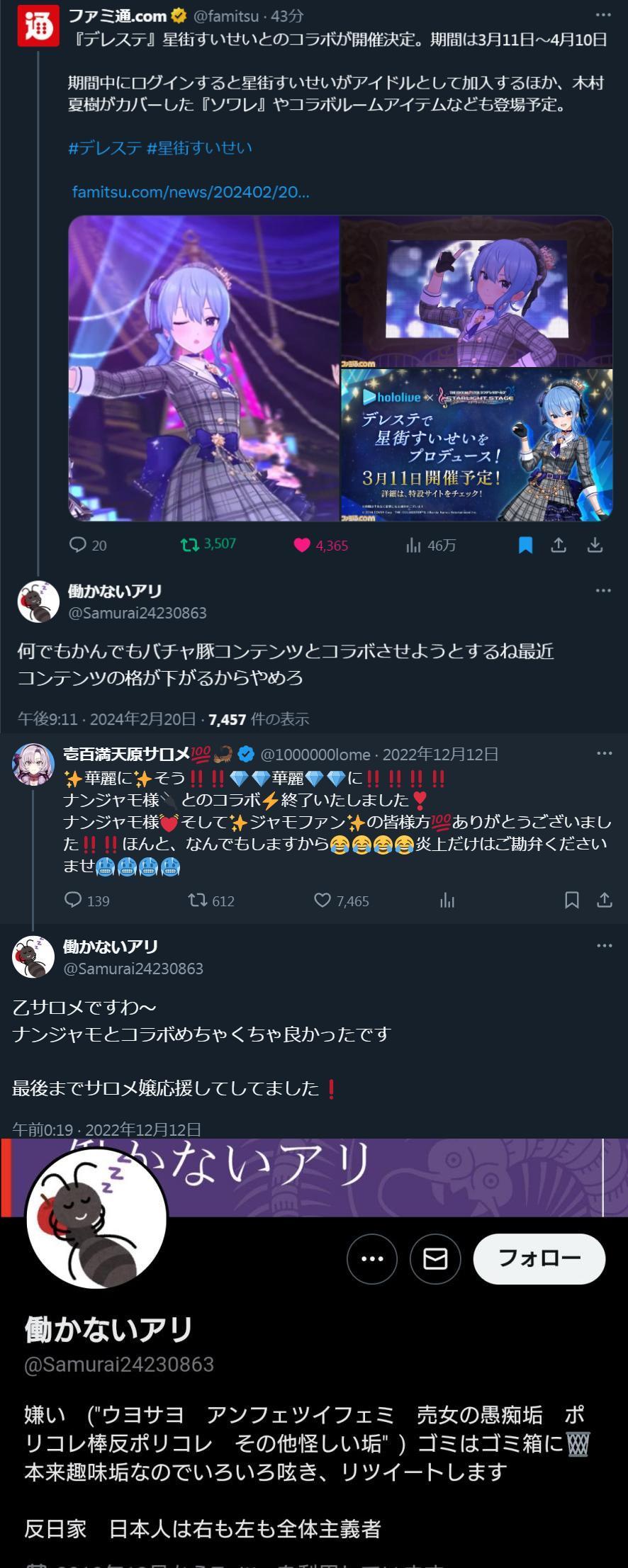| … | 4325/11/01(土)17:37:59No.1368425278そうだねx3>先行でチケット売った後に後出しでコラボ発表してコラボステージもがっつりやります返金は対応しませんはVとか関係なく相手がガチャピンでも名探偵コナンでも荒れるよ |