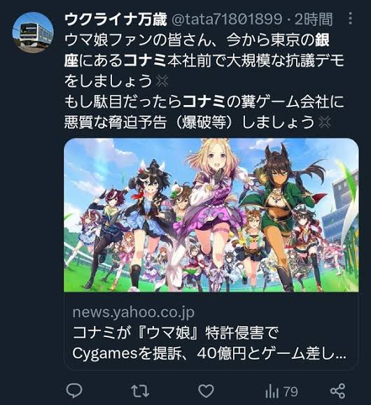| … | 90225/11/01(土)18:42:55No.1368446681+コナミ「ウマ娘を(とりあえず)訴えます」 |