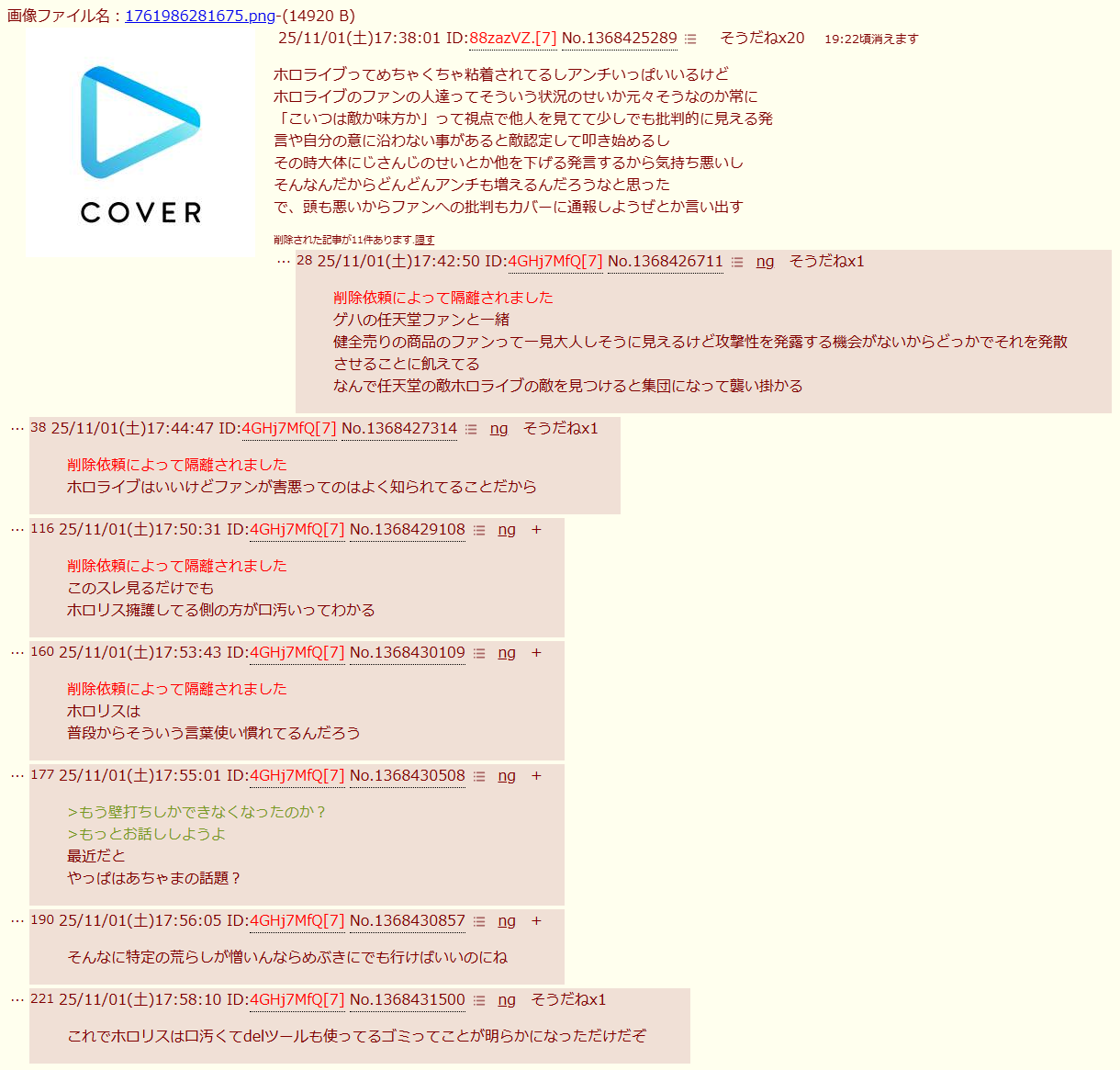 | … | 5025/11/01(土)17:46:00No.1368427691そうだねx4>ホロライブはいいけどファンが害悪ってのはよく知られてることだから |