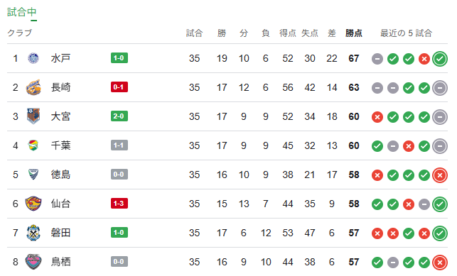 | … | 34625/11/02(日)16:32:49No.1368771110+6位以内のチームで得失点差は大宮が他を圧倒してるから上位3チームからすると勝ち点で並ばれると命取りになる |
