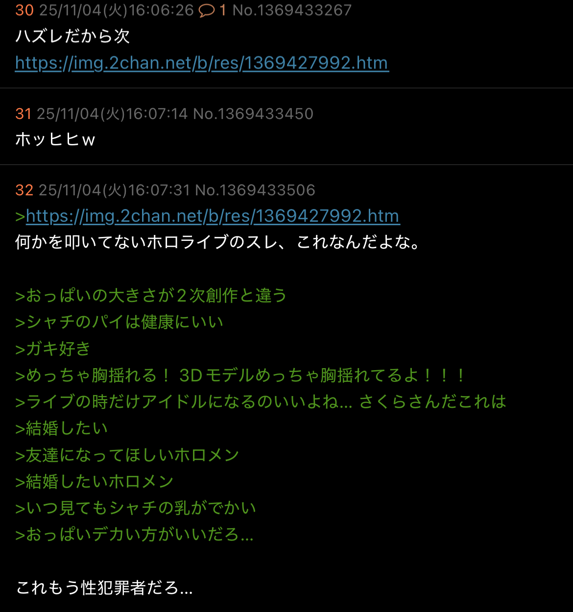 | … | 10025/11/04(火)17:26:01No.1369450336+メンバーになって脳みそちんぽ野郎だって噂されると恥ずかしいし… |