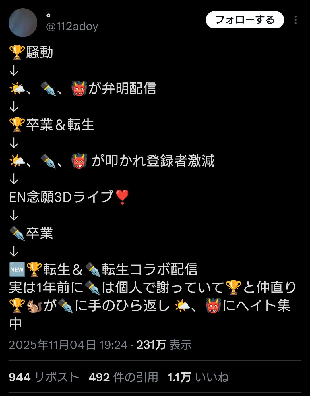 | … | 6325/11/05(水)00:27:38No.1369589282そうだねx3勝ち馬乗ったつもりで運営側について卒業者叩きまくってたライバーみんな落ちぶれてったなあ |