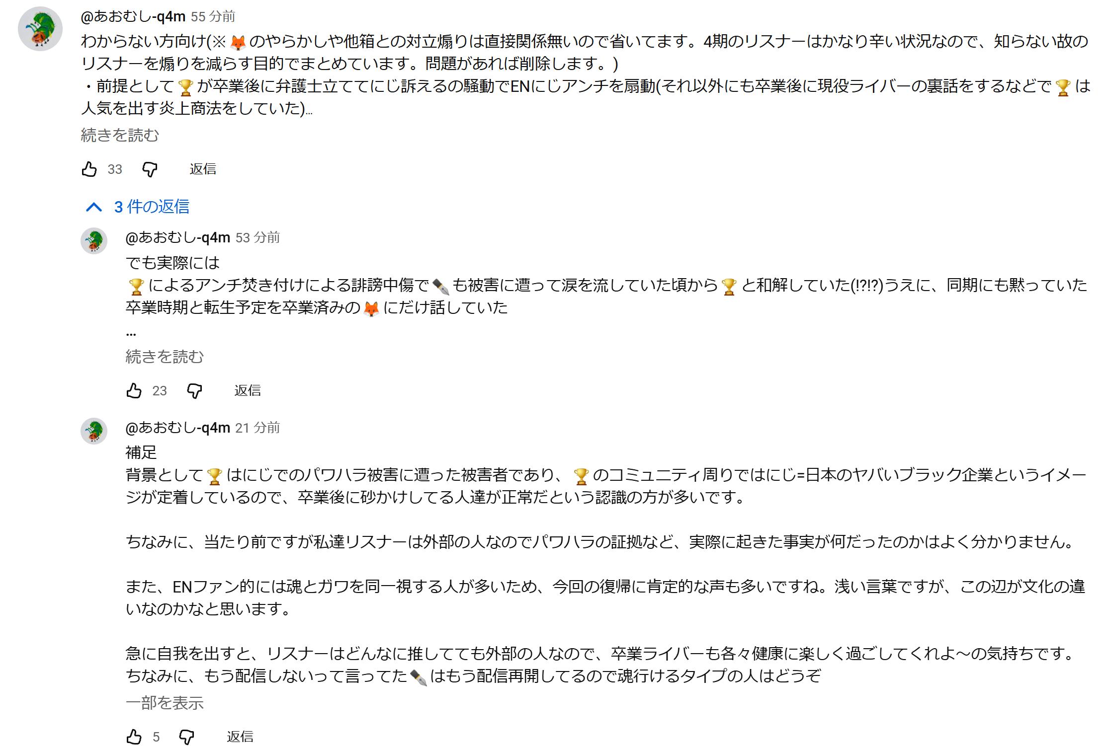 | … | 6825/11/05(水)00:32:02No.1369590420そうだねx1>捏造でにじさんじ擁護しながら対立煽りがーってお外でもやってんだ… |