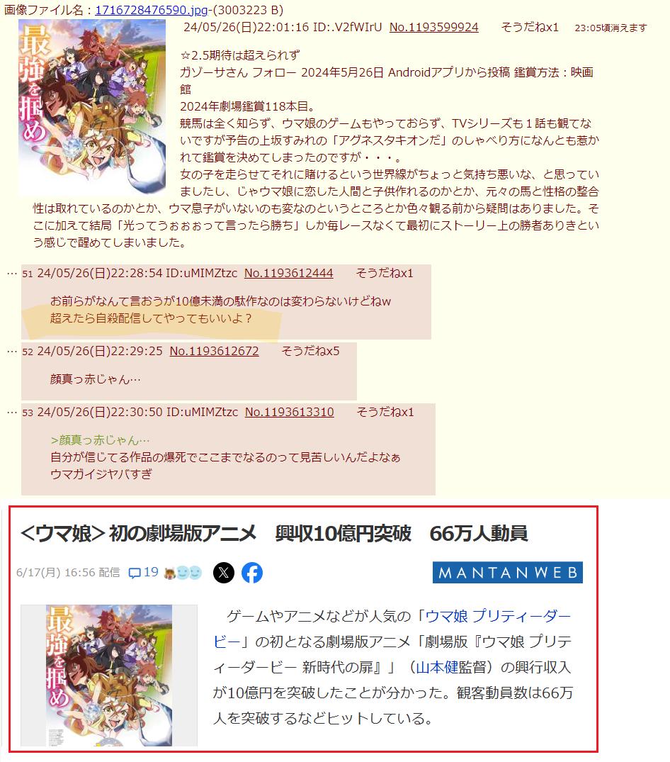 | … | 9625/11/05(水)17:43:31No.1369741619+どうせウマ娘が流行ってなかったら学マス辺りにでも噛みついてたんだろうな |