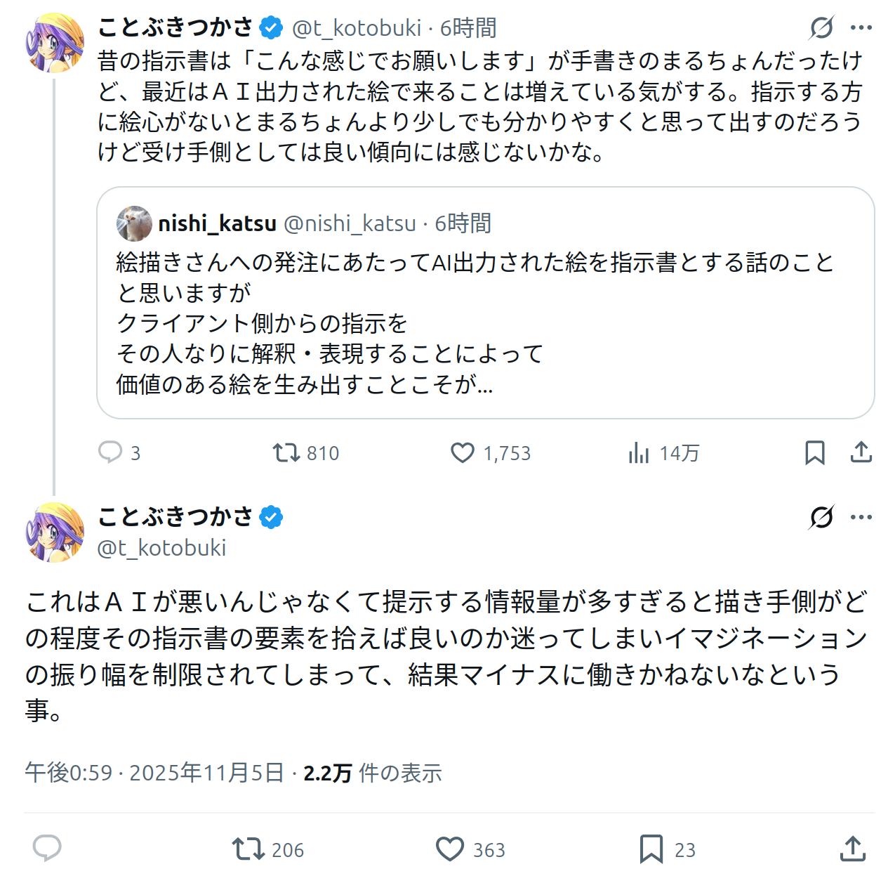 | … | 1125/11/05(水)19:08:08No.1369766611+>これはことぶきつかさ先生が生成AIを否定してるというわけではない |