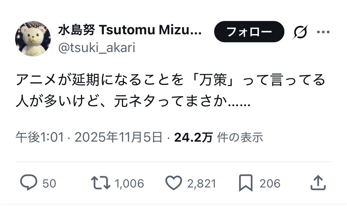| … | 5225/11/06(木)04:39:17No.1369901367そうだねx19アニメ制作陣関連は頑張ってますとかチラムネよろしくとかしかメでつぶやいてないから |