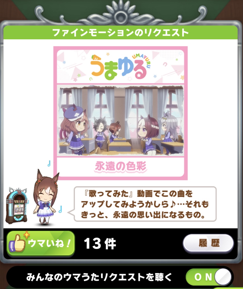 | … | 8025/11/07(金)00:20:44No.1370166932そうだねx1>ウマ娘はもう少し曲増えませんかね |