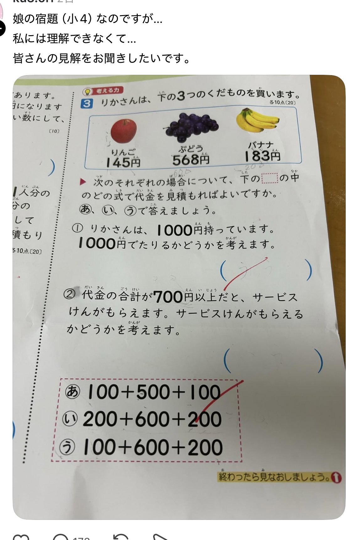 | … | 1525/11/08(土)09:46:29No.1370529646そうだねx35>3つのくだものを買いますって言ってるのに700円分しか買わない二問目はなんか矛盾してないか? |