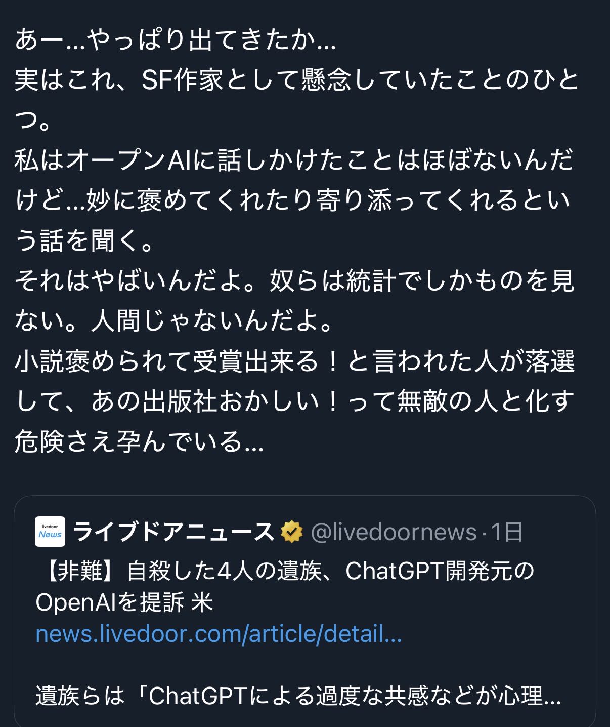 | … | 525/11/09(日)13:42:18No.1370949684そうだねx13自殺したい人が最後の後押しで使ったのがAIだったってだけでAIが無くても何かの別のきっかけで死んでたんじゃねーのと思う |