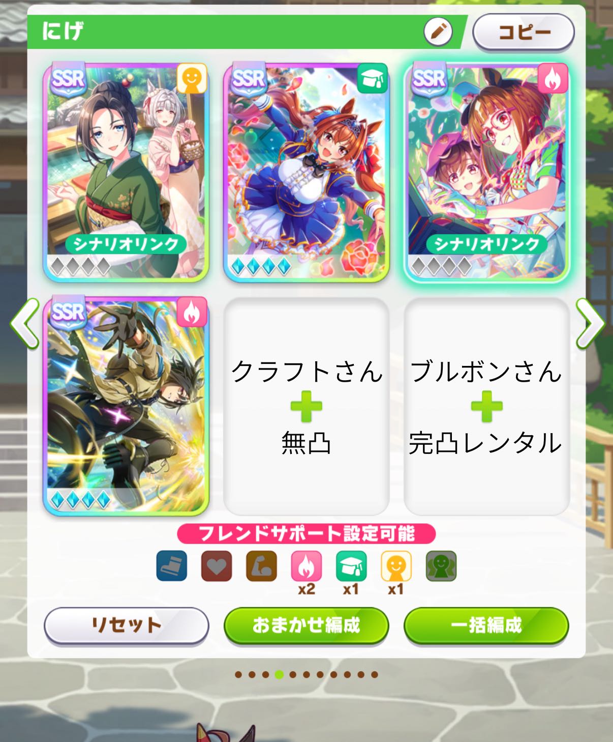 | … | 3325/11/09(日)14:01:47 ID:EBs5JGVoNo.1370955488+逃げで直近のリグヒ用編成だとだとパワーブルボンさん根トランさん女将アモアイさん賢ダスカさんまでは決まりなんでしょうけど最後の一枚どうなるんでしょうね? |