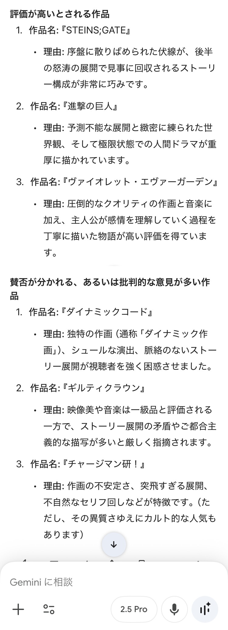 | … | 5225/11/10(月)14:21:46No.1371297875+うちのgeminiは面白いアニメにシュタインズゲートと宇宙よりも遠い場所 |