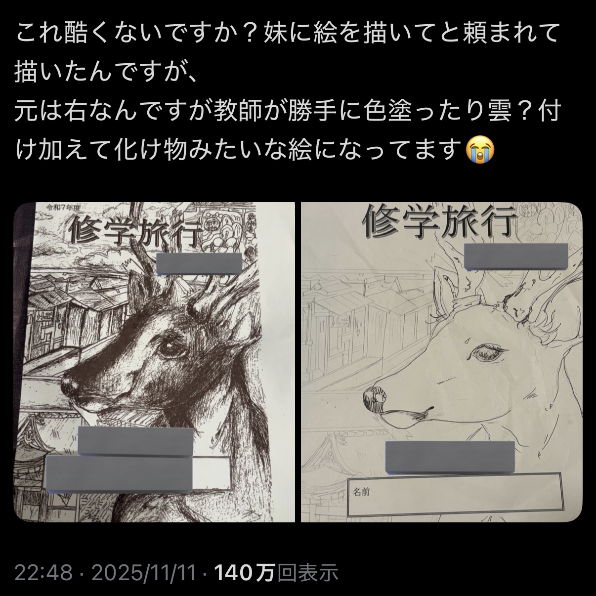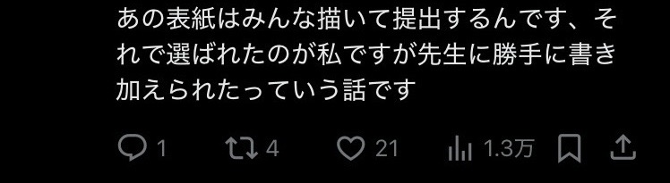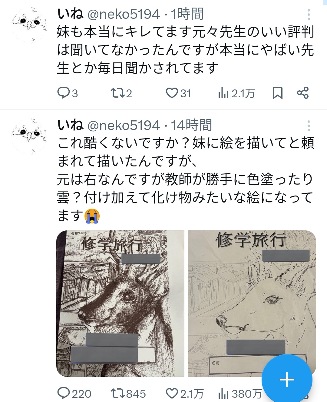| … | 1225/11/12(水)12:28:22No.1371871447そうだねx26頼みはしたが出来上がったものが採用に達するクオリティではなかったから教師が加筆したってだけじゃない |