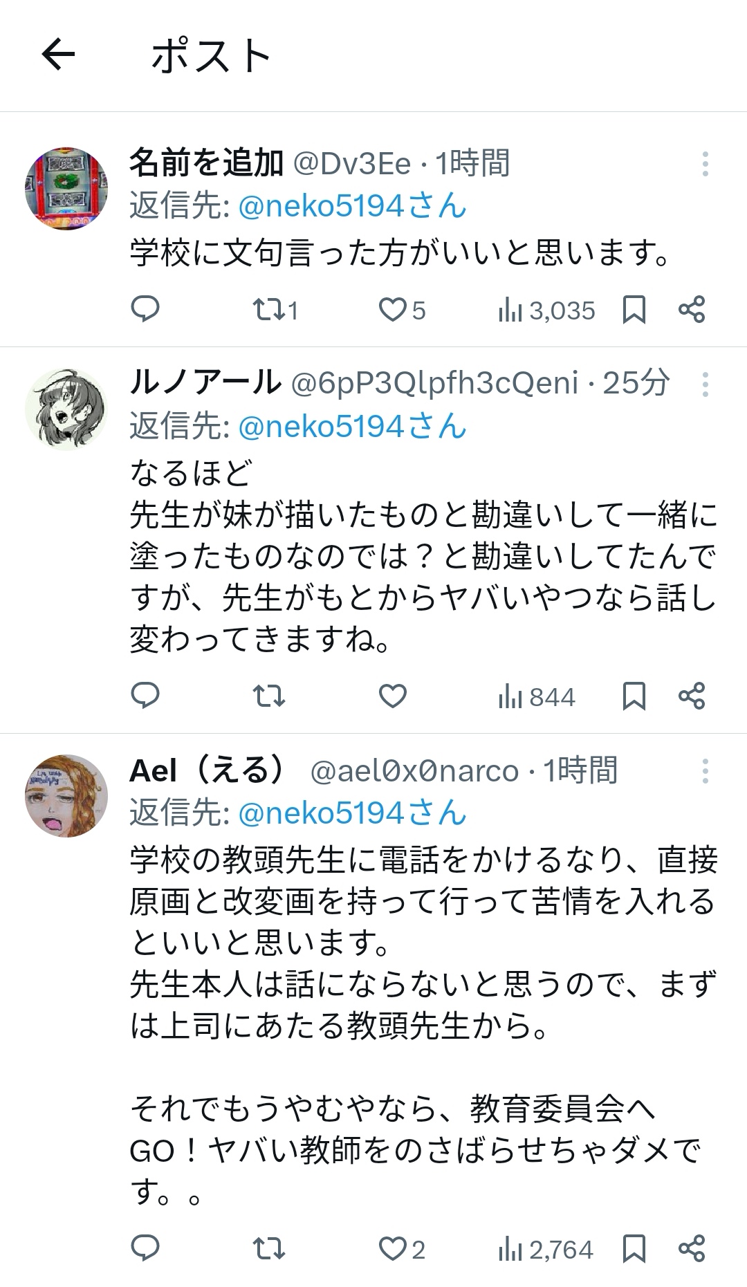 | … | 52425/11/12(水)14:01:05No.1371896042そうだねx1色々嘘が多そうだけど唯一本当だと分かったのはこの姉が心底イラついてて先生を叩く方向に誘導したいと思ってるということだ |