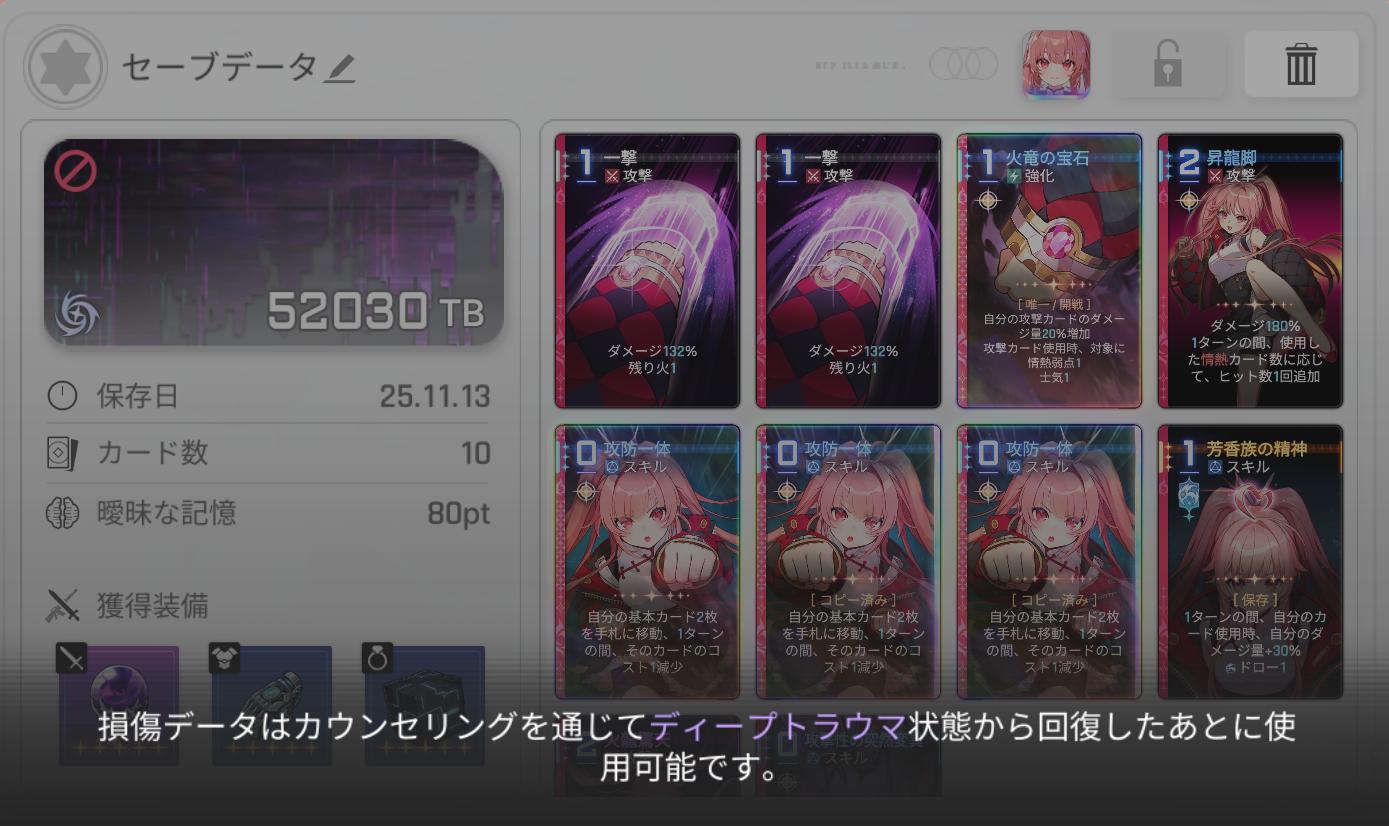 | … | 74225/11/13(木)17:14:05No.1372234666+>崩壊から立ち直ったとき元に戻ったカードが使えなくなることがあるんだけどおま環? わたくしもそれで負けたことがあるでございます 確実にバグなので報告して欲しいでございます |