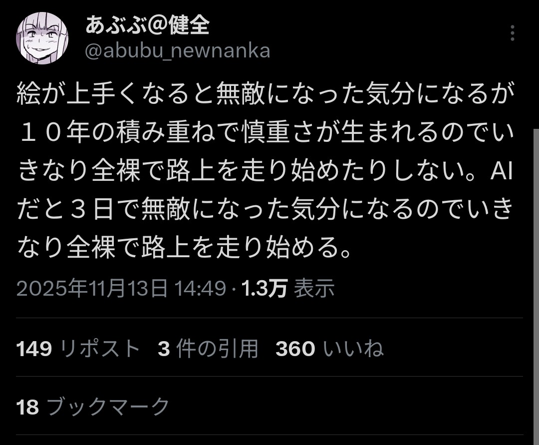 | … | 4525/11/13(木)17:43:29No.1372242168+あぶぶくらいの温度感ならともかくAI完全排除論をXでやってるの救われねえなって |
