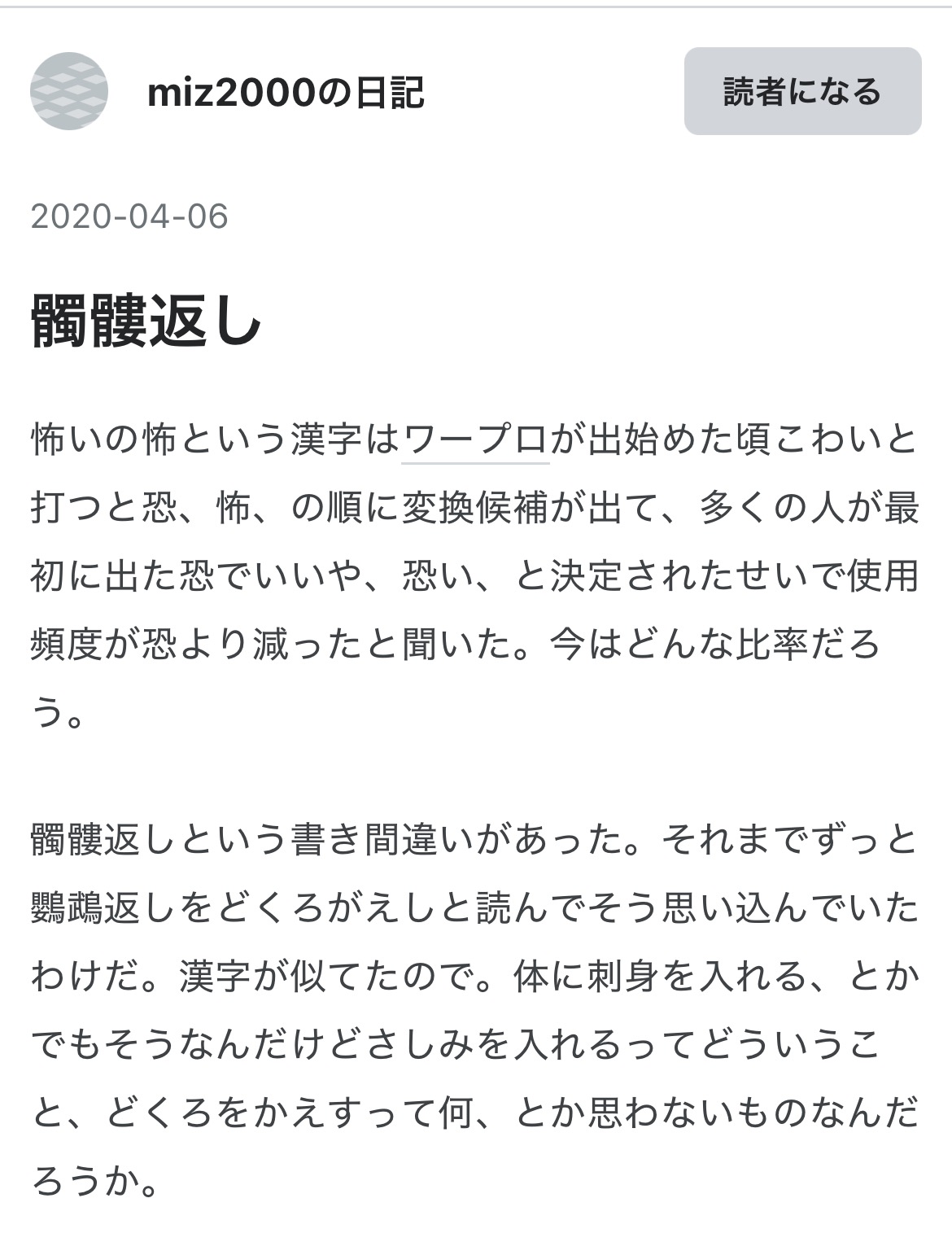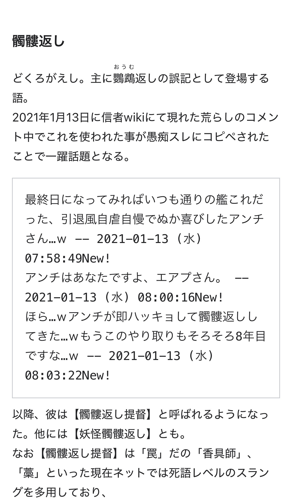 | … | 3125/11/14(金)07:36:58No.1372409146+>鸚鵡返しを髑髏返しと思ってたってこと?よしんばそうだとしても変換した時にそんな言葉存在しないんやなって思わないのか…? |