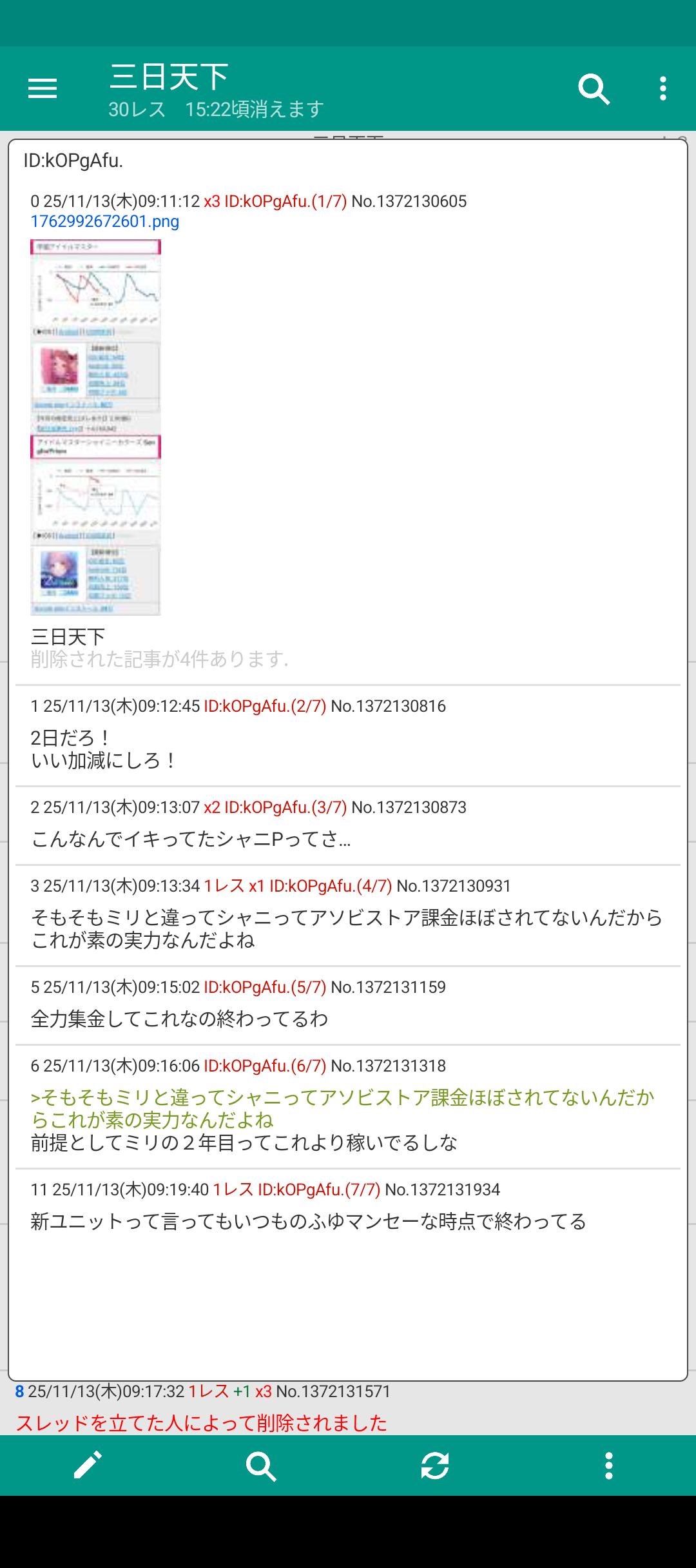 | … | 16725/11/14(金)12:40:29No.1372467039+わざわざ消すって事は同じやつ立ててんのか |