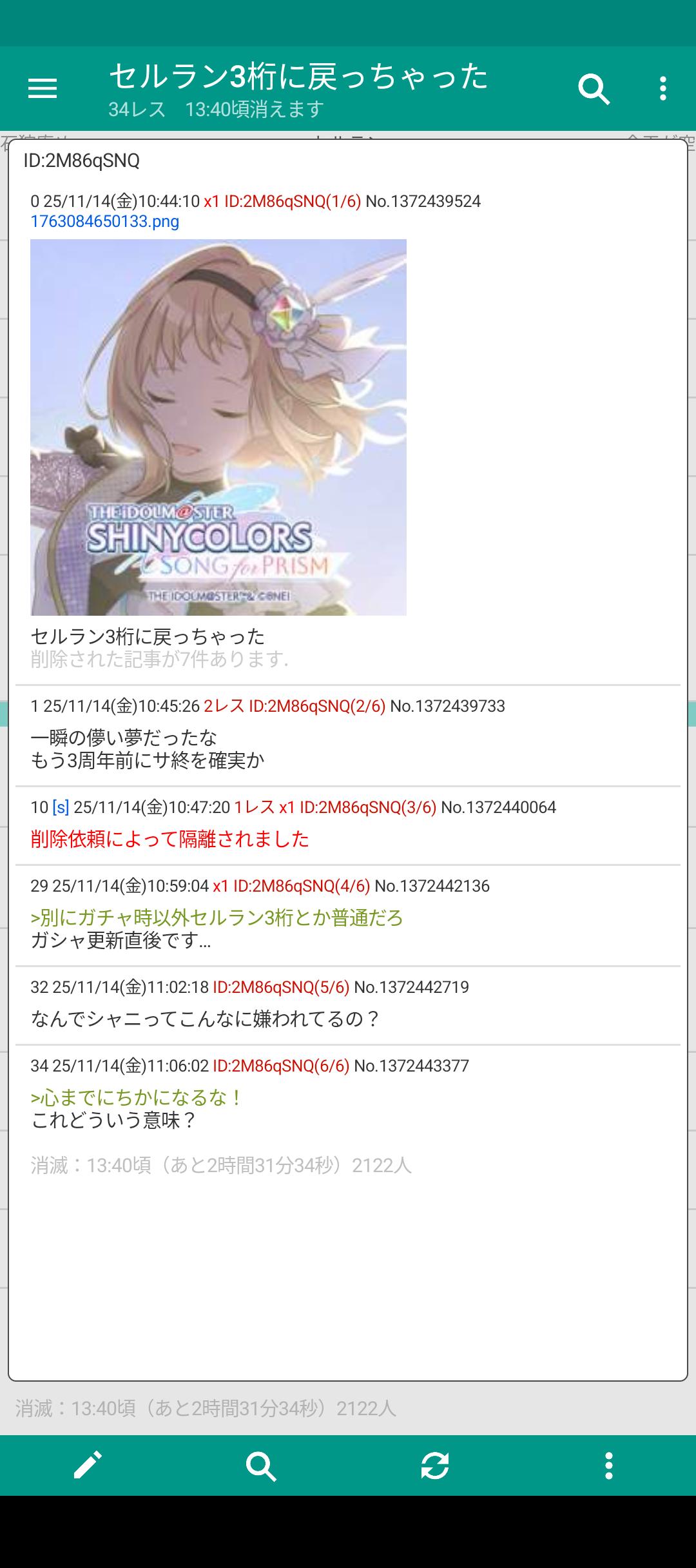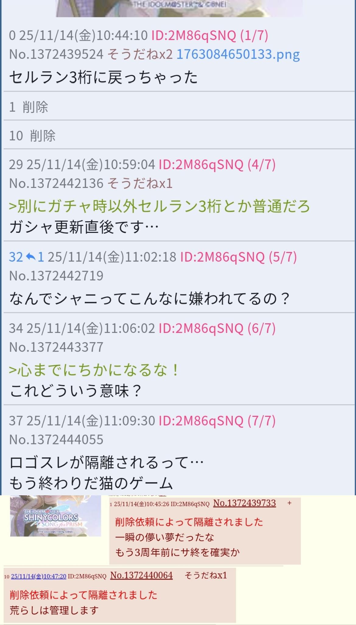 | … | 3025/11/14(金)10:59:29No.1372442214そうだねx3まあなんというかそもそもシャニマスに限らずここでアプリアイコンで立ててるスレでマトモなスレは1%にも満たないと言っていいだろうしカタログからでもdel対象だろうからまあ |