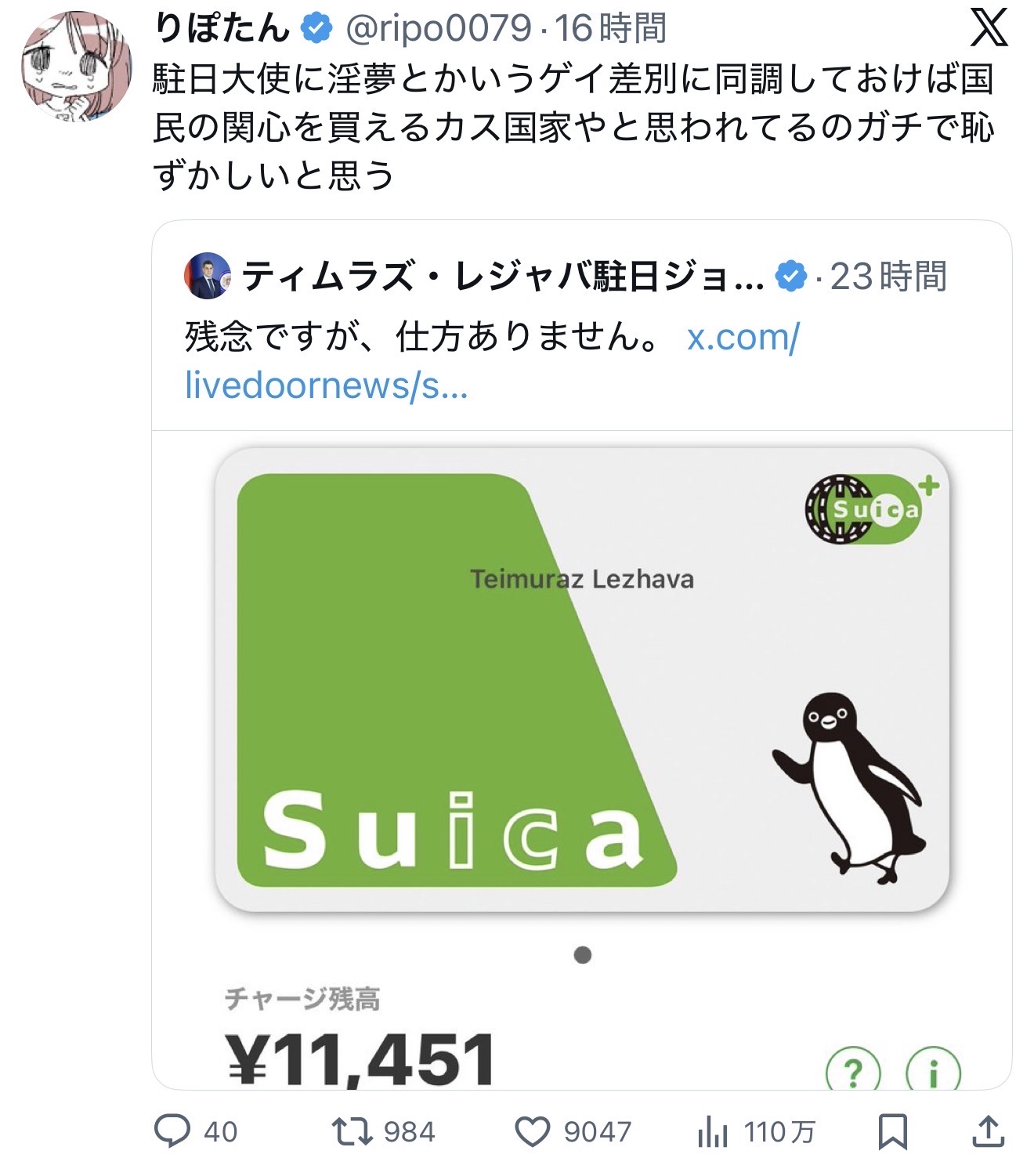| … | 525/11/14(金)16:57:33No.1372522556そうだねx2911451円チャージされてることの何がゲイ差別に繋がるの? |