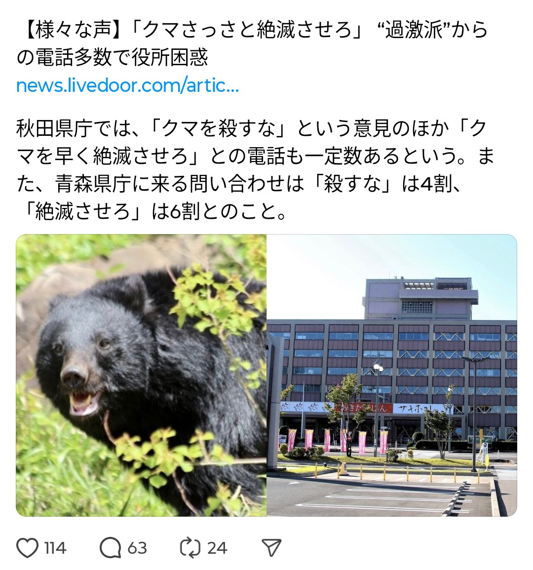 | … | 30825/11/14(金)20:31:06No.1372592574+以前どっかの役所で話題になった時もクマを殺すなって迷惑電話よりクマを殺せって迷惑電話の方が多いって話をしてたけど |