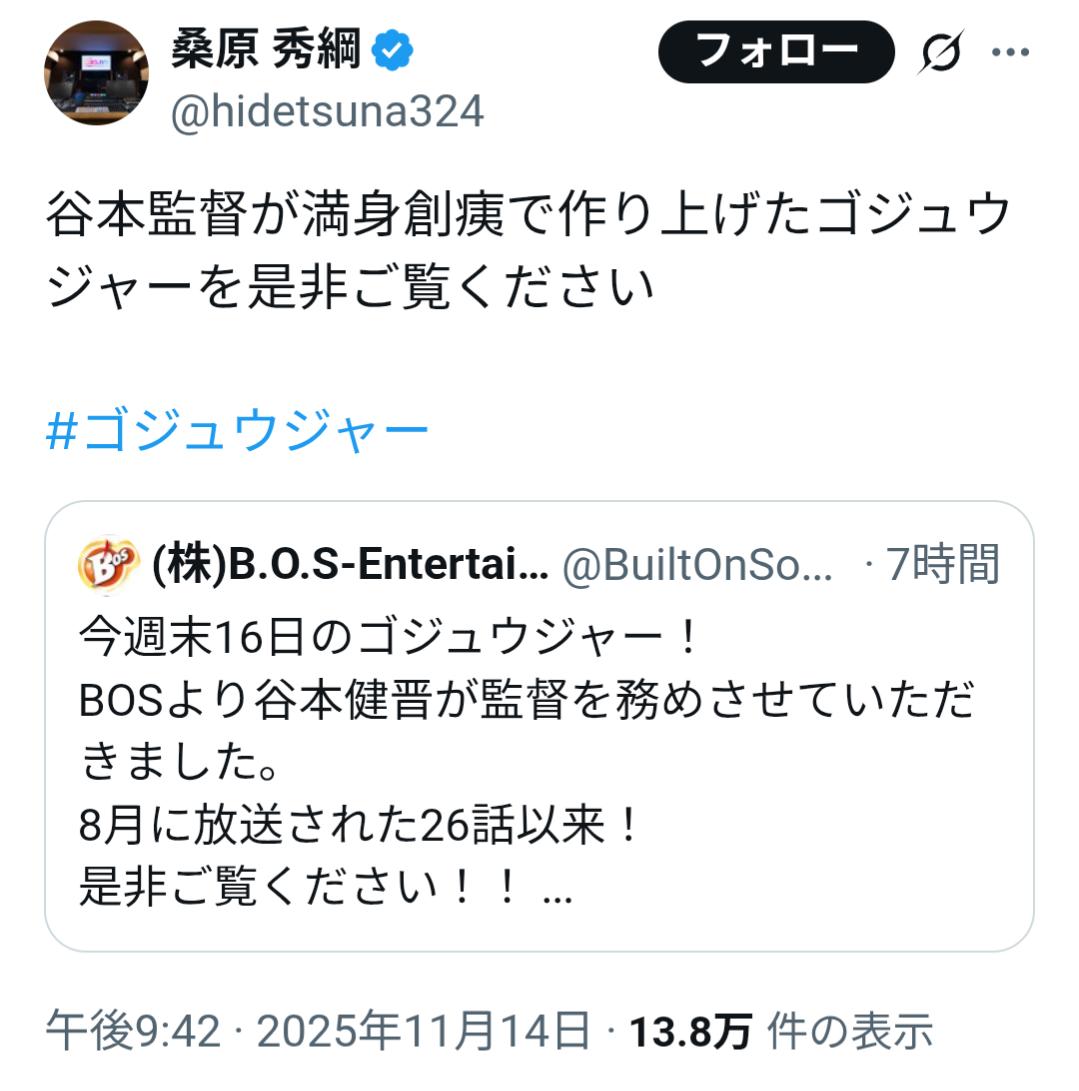 | … | 2025/11/15(土)09:42:12No.1372743684+>また特撮OBだろうと思ってたけどそっちから?! |