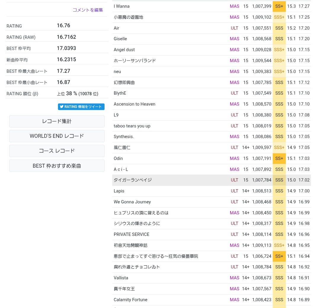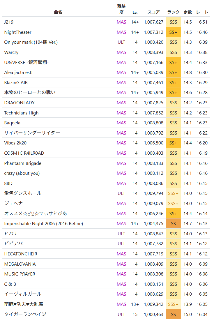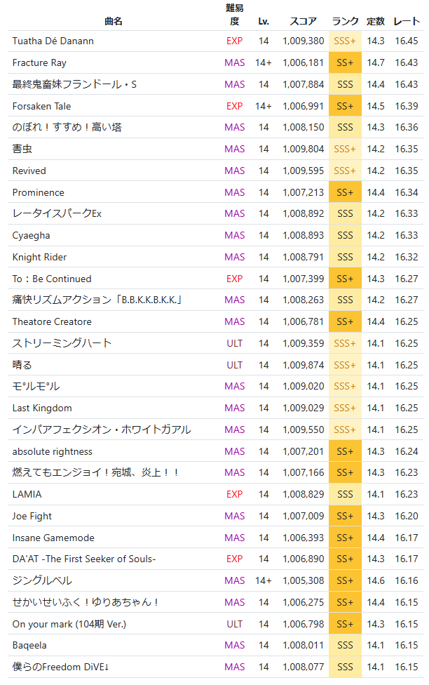 | … | 5225/11/15(土)23:10:59No.1372987466+レート表見て思ったけど今は版権曲でも難しい曲多いんだねチュウニ |