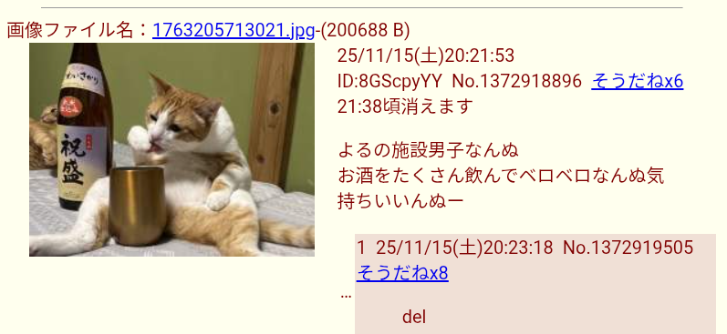 | … | 1125/11/16(日)09:22:23No.1373081620そうだねx2>昨日の飲み過ぎで二日酔いなんぬ |