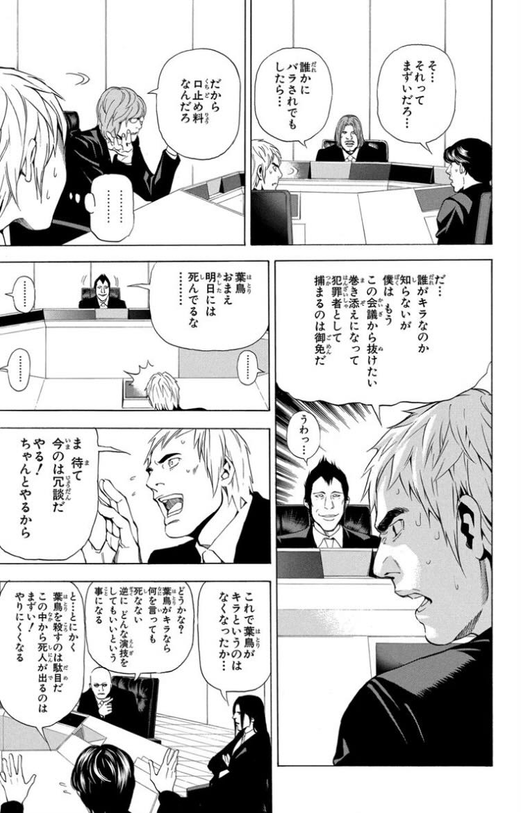 | … | 12325/11/16(日)12:38:07No.1373131010+奈南川、三堂、モーフィアス、眼鏡、紙村…とこんな会議を開かせるキラ側になる動機が薄い奴らを集めすぎた |