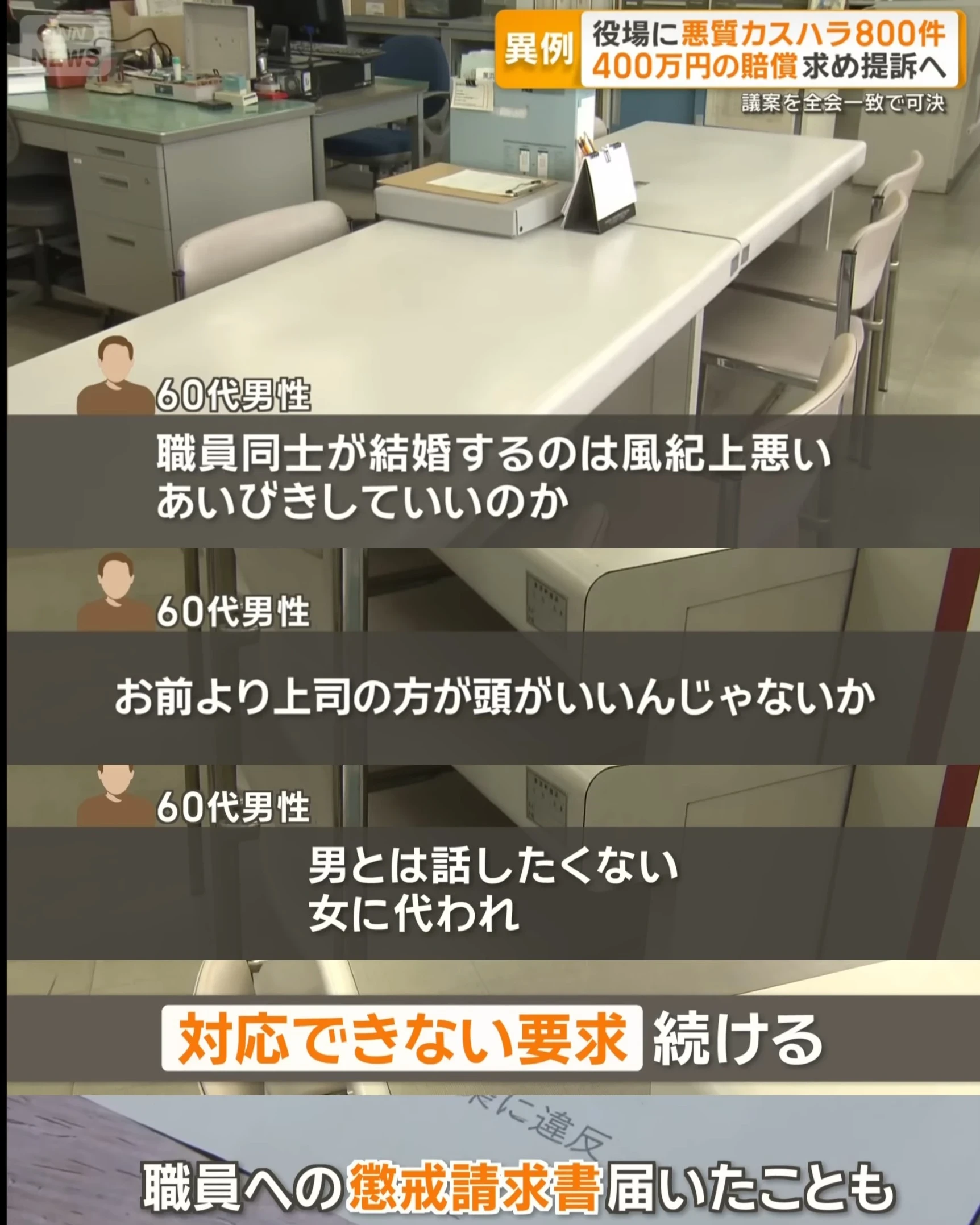 | … | 30125/11/17(月)17:25:28No.1373516666+>町によると、男性によるカスハラ行為はほぼすべての部署で確認され、今年4月から先週までの間だけでも、電話や文書などで800件以上に上っているということです。 |