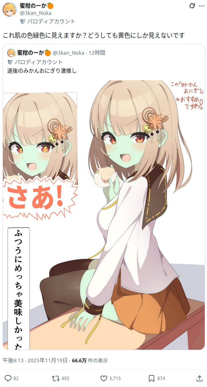 | … | 325/11/20(木)06:33:05No.1374321876そうだねx16元のキャラ知らんしみかんおにぎり好きのゴブリンとして見たらかわいい |