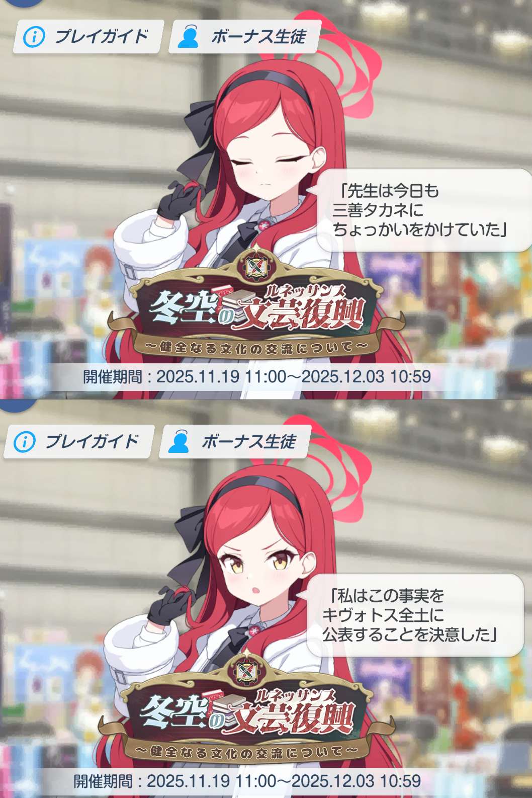 | … | 8425/11/21(金)15:15:55No.1374719562+今回のイベント面白かったけど正直出版部の二人の掘り下げとしては不十分だったからもっと出番くれ |