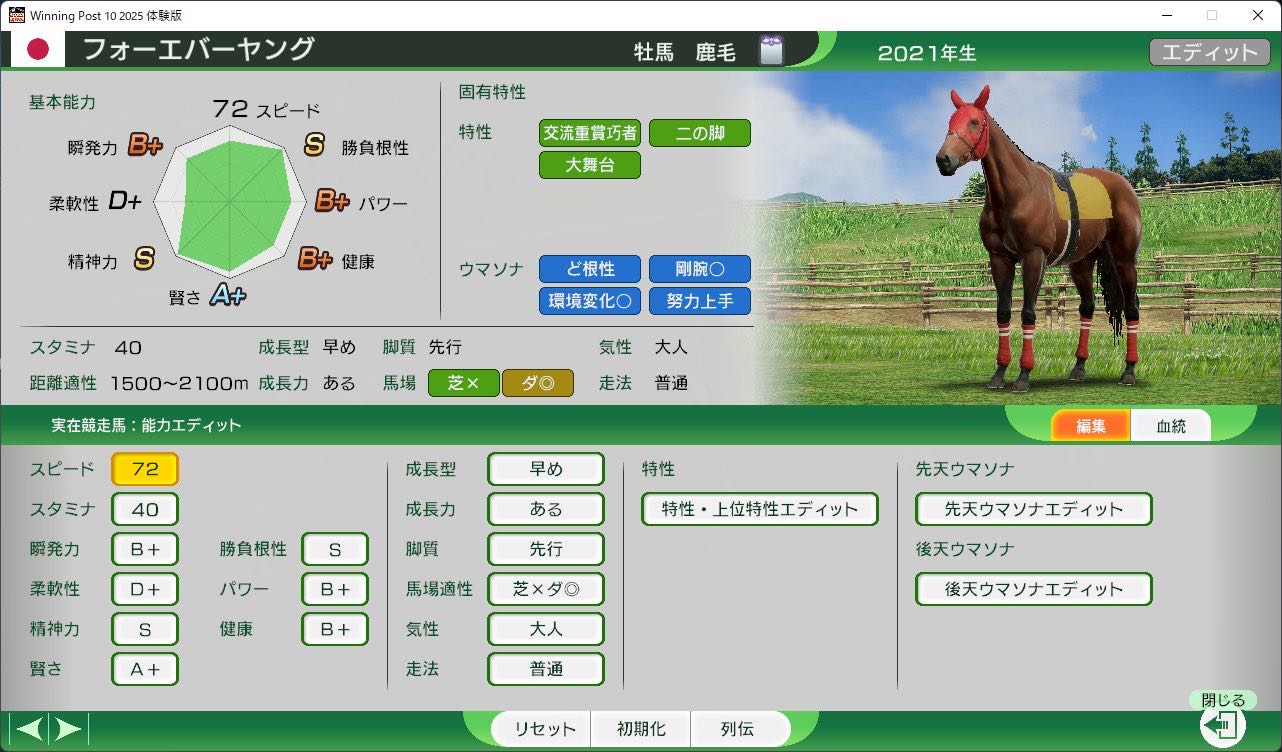 | … | 3425/11/21(金)17:17:37No.1374744218+過去スタート3年戻りますけど種牡馬収録から現役収録で強化されそうなのってなにがいます? |